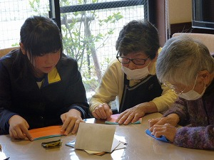 2月7日(金)本校のJRC委員会の子どもたちが、地域の老人ホーム「まんてん」さんに訪問しました。ホームの皆さんに喜んでもらえる活動をしようと計画した結果、出し物と一緒に何か作ること、プレゼントを考えました。