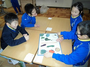 次に、その日の給食に使われていた野菜のなかま分けを考えました。