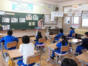 2月7日(金)、草津市立志津南小学校の4年生の皆さんが、びわ湖一周の学習の途中に本校に立ち寄りました。11時頃、JRを利用して来校し、昼食をとりました。