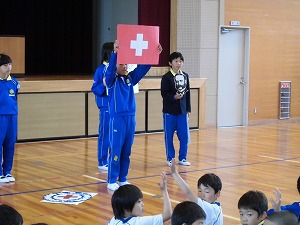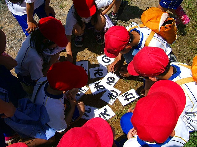 答えは・・・「みんなのえがお(が)きんメダル」。しかし、さすが子どもたちの頭はやわらかく、同じ文字で「みんなのえがお(が)きめるんだ」という答えを作り出した班が!感心するばかりでした。