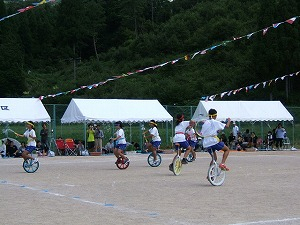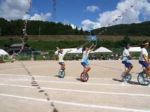昼食前に、今年は6年生有志による「一輪車演技」を披露しました。賛助会で購入してもらった一輪車で、昨年から練習していたものです。