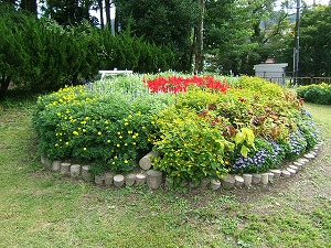 春から委員会活動で栽培してきた「サルビア」(赤・青・白)「マリーゴールド」「コリウス」「アゲラタム」「メランポジウム」を使ったメイン花壇の花が今咲きほこっています。