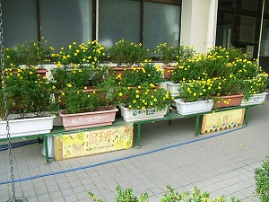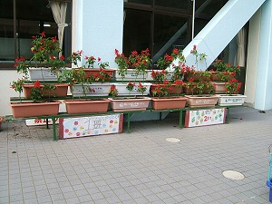 豊かな人間関係をつくる「たてわり活動」の一貫として、花の栽培も「たてわりフラワー」と銘打ってたてわりで行っています。運動会では、各色の花のプランターを運動場に飾りました。