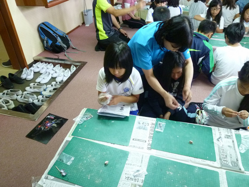 昔の遊びでは、めんこ、けん玉、お手玉、おはじきを一緒に楽しみました。