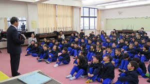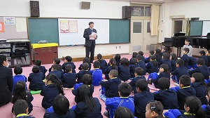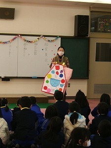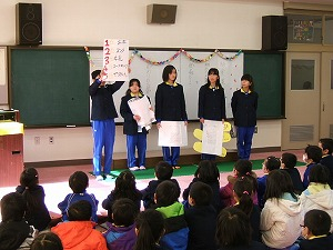そのあと、いつも給食でお世話になっている、給食センターの方、校務員の杉本さん、牛乳屋さん、パン屋さんに、感謝のプレゼントをお渡ししました。