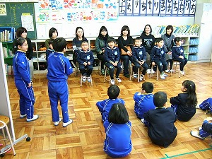 来年度、6年生と新入生の関係になります。顔と名前を覚えてもらおうと自己紹介をしました。