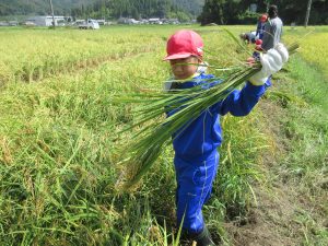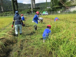 5年生8名が稲刈り体験を行いました。暑い中でしたが、阿辻さんに稲の刈り方を教えていただいて、頑張って作業しました。阿辻農園の皆さん、学運協さん、農協の皆さん、総勢10名ものお手伝いをいただきました。ありがとうございました。